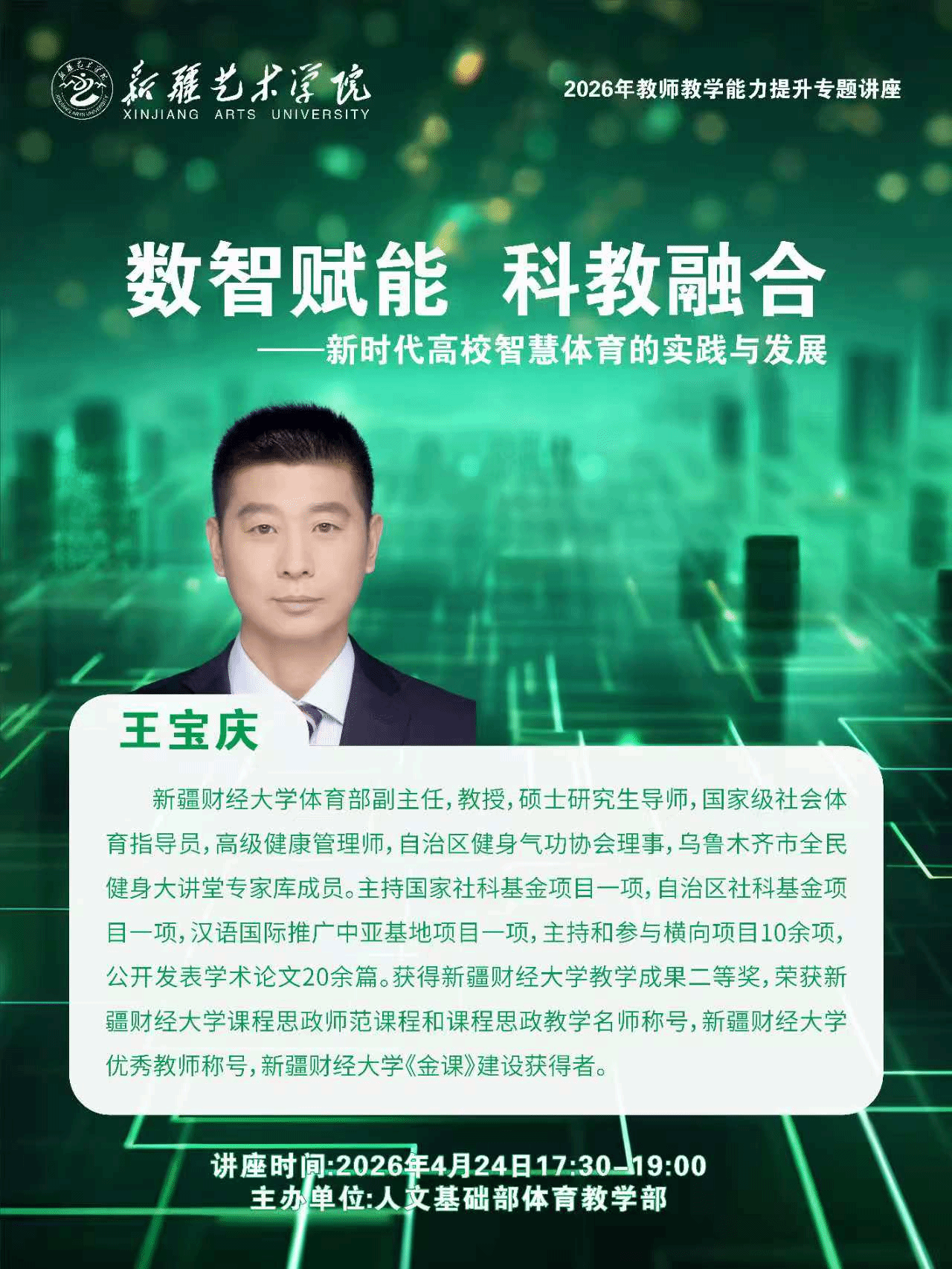 为深入学习贯彻新时代党的教育方针,以党建引领教育教学改革,落实融合育人理念,提升教师教学教研专业能力。4月24日下午,人文基础部党总支以“艺术+科技”教师教学教研能力提升培训暨高校智慧体育交流研讨会为载体,开展主题党日活动。本次活动特邀新疆财经大学王宝庆教授作专题讲座,人文基础部全体党员教师、教职工代表与新疆工程学院体育教研部教师齐聚一堂,共同探索智慧体育与科教融合发展新路径,以党建促业务,以业务强党建,推动教育教学工作提质增效。