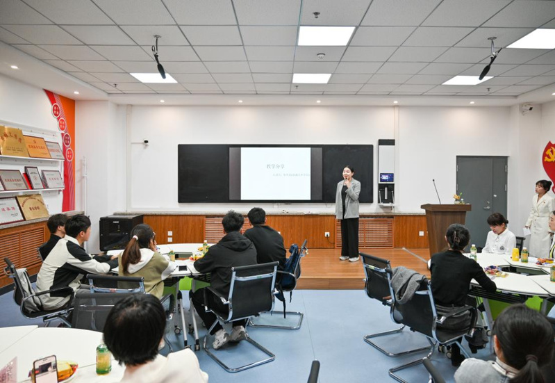 人文基础部语言文化教学部主任赵星星在汇报中系统介绍了课堂浸润—实践拓展—评价体系三位一体的育人模式。教师代表靳淞茹以个人梦—中国梦为主题进行了教学能力展示,展现了如何通过大学英语课堂讲好中国故事。